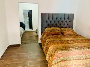 En segunda planta. Con vista privilegiada hacia piscina y jardín-estacionamiento. De triple cama matrimonial. Con muebles de jardín para exteriores en terraza privada y en balcón de uso común. Doble baño completo, ambos con combinación de ducha, sanitario y lavabo. Muy cómoda. Es para 6 personas pero se admiten hasta 9 personas en esta habitación, pagando por persona extra.