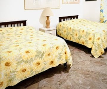 En primera planta. De doble cama matrimonial, ideal para cuatro personas, con muebles de uso común en terraza exterior. Combinación de ducha, sanitario y lavabo. Con vista a jardines y estacionamiento general. Muy cómoda. Es para 4 personas pero se admiten hasta 6 personas en esta habitación, pagando por persona extra.