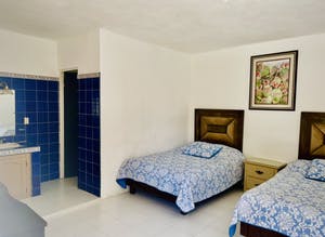 En primera planta. De doble cama matrimonial, ideal hasta para 4 personas, con vista lateral hacia la piscina y jardín. Combinación de ducha y sanitario. Lavabo aparte y pequeño closet. Cuenta con comedor de jardín exclusivo. Es para 4 personas pero se admiten hasta 6 personas en esta habitación, pagando por persona extra.