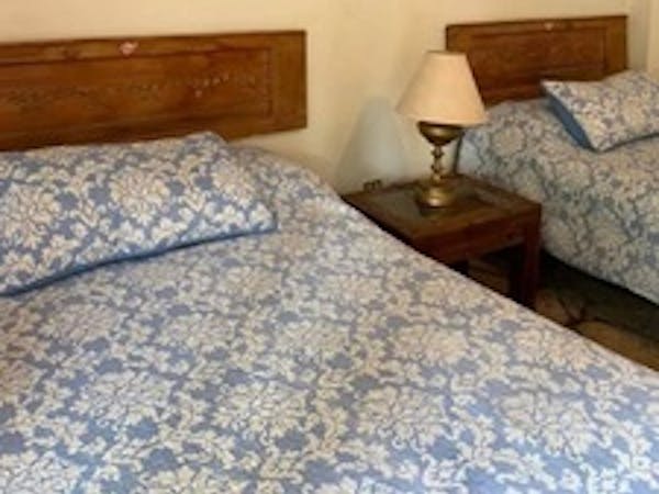 On the first floor. With two double beds, ideal for four people, located by the pool area, with double views of the garden and pool and main common areas. Combination shower and toilet, sink inside the room. Up to 6 people are allowed in this room.
