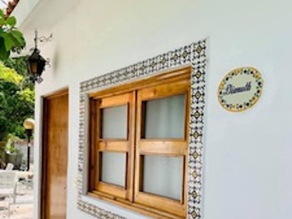 On the first floor. Triple, ideal for 6 people. Located in the front. It consists of two rooms with side walls without doors, two double beds, two single beds and a pull-out loveseat to store luggage. A/C in the first room and a ceiling fan in the second. Because there is no intermediate door and the air conditioning, in addition to being 2 tons, hits directly, it is very comfortable to sleep in, it has a full bathroom. With fridge. Very close to the tavern, restaurant, lobby and pool. View of the front garden and patio. Up to 9 people are allowed in this room.